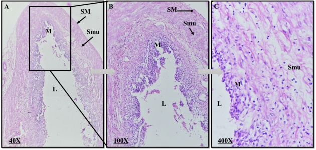 Plate 4: Photomicrograph of a rabbit normal Intestine. L=Lumen, M=Mucosa, Smu=Submucosa, SM=Smooth muscles. (H&E, magnification 40X, 100X, 400X).